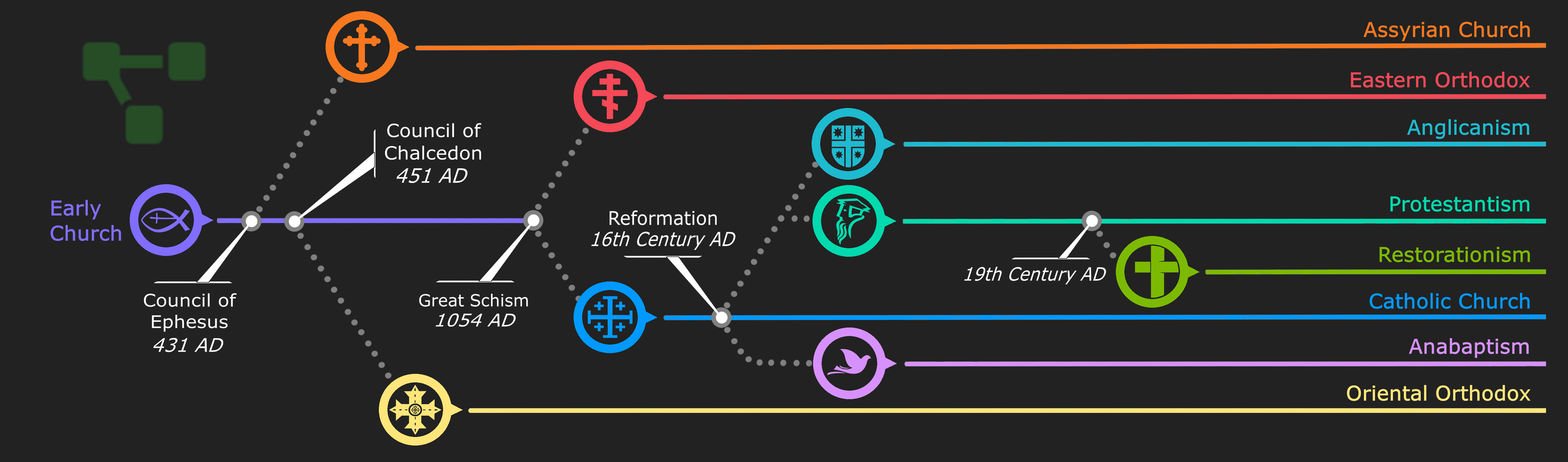 Anabaptism branched out from the Catholic Church Protestantism branched out from the Catholic Church Anglicanism branched out from Catholic Church..."via media" (middle way between Protestant and Catholic traditions)